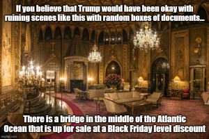 The bathroom is clean, indicating regular use, and the boxes block entry to the shower/bath area, suggesting that the bathroom was a staging area, by the FBI, for collection and movement to an area under FBI/DOJ control. The propagandists would like their audience to believe that these boxes were stashed “as is,” in the bathroom, in the ballroom, and in other locations, by Donald Trump and by his staff. However, photos taken of the interior of the Mar a Lago mansion shows that Donald Trump is a neat freak. Having random, stacked boxes, in places like the bathroom or ballroom would have driven him up the wall.