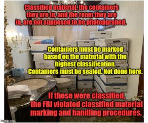 Two of my years in the military involved being a classified publications custodian. The photos that have been released, related to the alleged classified materials possession, handling, etc., are from the FBI/DOJ. There are certain procedures that have to be in place when it comes to these materials. The released photos suggest that these procedures were not followed… Unless classified materials handling and security requirements changed since the 20th Century.