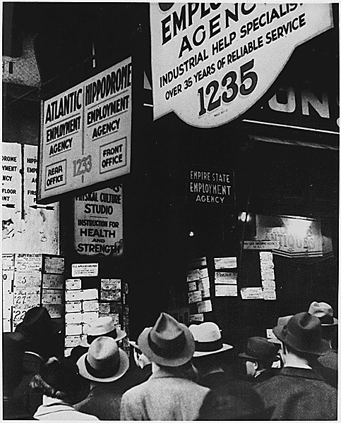 Men check for jobs at unemployment office yesterday in New York City.