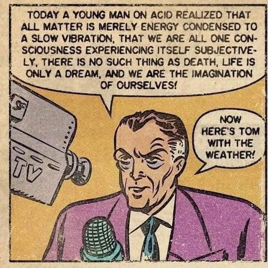 The Newsman announces that a young man on acid came to a realization in one “trip” that folks who meditate and/or study scripture take longer to conclude… That we are all a part of a single consciousness experiencing things through each of us, that death is an illusion, that our physical world is also an illusion to the soul, etc. Perhaps seeing this on the news would be better than hearing the nonsense that many journalists like to provide. Enjoy your weekend!