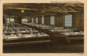 The postcard of the Ft. Lostinthewoods mess hall reminds me of a 1947 photo of my Dad at Ft. Jackson.