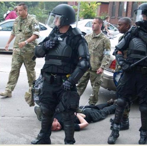 Not an Army unit, not a fake cop, not theater – three Pittsbugh SWAT guys doing a snatch team set-up on a demonstrator who is an influencer to the crowd.