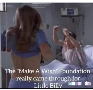 The Make A Wish meme is from season 1, episode 5 of Scrubs, title My Two Dads. The kid’s name is Jered and the barer is Doctor Elliot Reid played by Sarah Chalke.