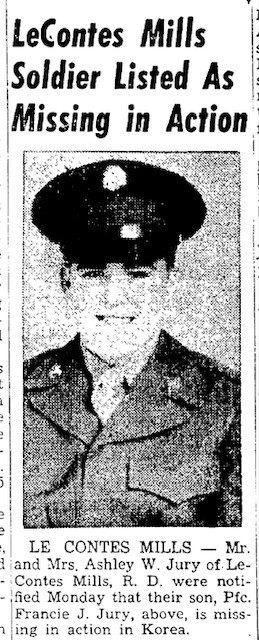 “Jury was the son of Mr. and Mrs. Ashley W. Jury of LeContes Mills. He was the youngest of three sons, and his brothers Bennie and Vinnie were both World War II veterans. Bennie Jury was held as a prison of war by the Germans for 15 months.”