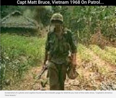 That section of the profile includes a photo of a soldier walking away from a burning hut in Vietnam. On the LinkedIn profile, the photo’s caption reads, “Capt Matt Bruce, Vietnam 1968 on Patrol…”