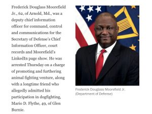 I did a quick search and only came up with, “Frederick Douglass Moorefield was a deputy chief information officer for command, control, and communications for the Office of the Secretary of Defense”, and that he was engaging in dog fighting for over 20 years.
