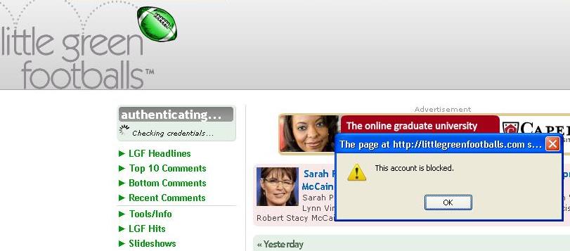 I posted a link in the linkviewer the other day to my post about the protest – Charles used to post all of my protest pictures, so I didn’t think he’d mind. And I didn’t think he was petty to the point of insanity. I went back today and found this when I tried to sign in;