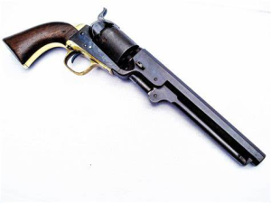 God created man…Colt made ’em equal. Not named for the Navy cause they adopted it, but for a Naval Scene depicting The Battle of Campeche, Texas and Yucatan v Mexico. It WAS adopted and used by Ol’ “Wild Bill”, “Doc” Holliday, and (gasps, clutches pearls…the HORROR!) RE Lee. Quick, melt down all copies of these RAYYYCISSS revolvers. Sam Griswold made 3600 some odd copies of Colt’s .36 in his former cotton gin plant for the CSA. Brass frames came from Church Bells and whatnot. Sold ’em for $50. If anyone happens to run into one of those, The Gun Bunny will pay you a coupla hundred $ for it. There may and/or may not be some reproductions of the Griswold and Colt’s Navy around Firebase Magnolia. Accurate as all hell and fun to shoot.