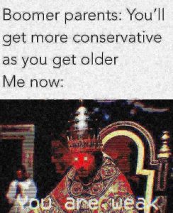 I remember when the Baby Boomers were criticized, by the older generations, as being liberal. The generations before them were conservatives. Today, the Baby Boomer generation has filled the conservative niche, and Generation X is shifting right. The person who created this meme will find himself/herself as a member of a conservative generation in two to three decades. Enjoy your weekend!