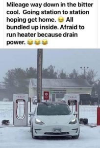 On the idiots in Chicago, that couldn’t understand why their car wasn’t immediately going up from 0%. (Energy is not the same liquid petroleum products!) Sort of like Gas if different from Diesel! Since your car sat out in the cold all night, and you only drove it two blocks to get here, the battery must warm to an acceptable level before we dump thousands of volts into it or it will fail! Either charge at home, slowly all night, and your car will work wonderful or put it in charge preparation mode and warm it up long enough before charging. Maybe if you read the manual, before screaming it doesn’t work…all of this could have been avoided!