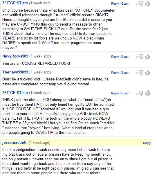We all remember Jessie MacBeth, the only person on the planet who we dislike as much as IVAW members dislike him. Well, I caught this conversation in my internet travels on his YouTube channel. Apparently, he has a group of defenders (or sockpuppets) who have no problem making the excuse for him that his stories are true but the government is persecuting him and falsifying his records to keep him quiet;