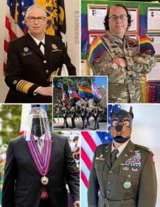 The US military is weak because they cater to the submissive. Look at the above photos: two “transwomen”, each of whom lived over half of their lives as men, before deciding that “Man, [they] Feel Like a Woman”. An AWOL SECDEF dressed like he’s the villain in some low-budget ’80s Star Wars rip-off. A recently retired Colonel who figured it was wise to take an “official photograph” as a Dog-Faced Soldier. Finally (I had to look it up), a “color guard” made up of members of a LBGT advocacy group, all looking resplendent in their military uniforms, almost as though they wish to represent their ideal of the military. Gay/lesbian? Promote. Trans? Promote ahead of peers.