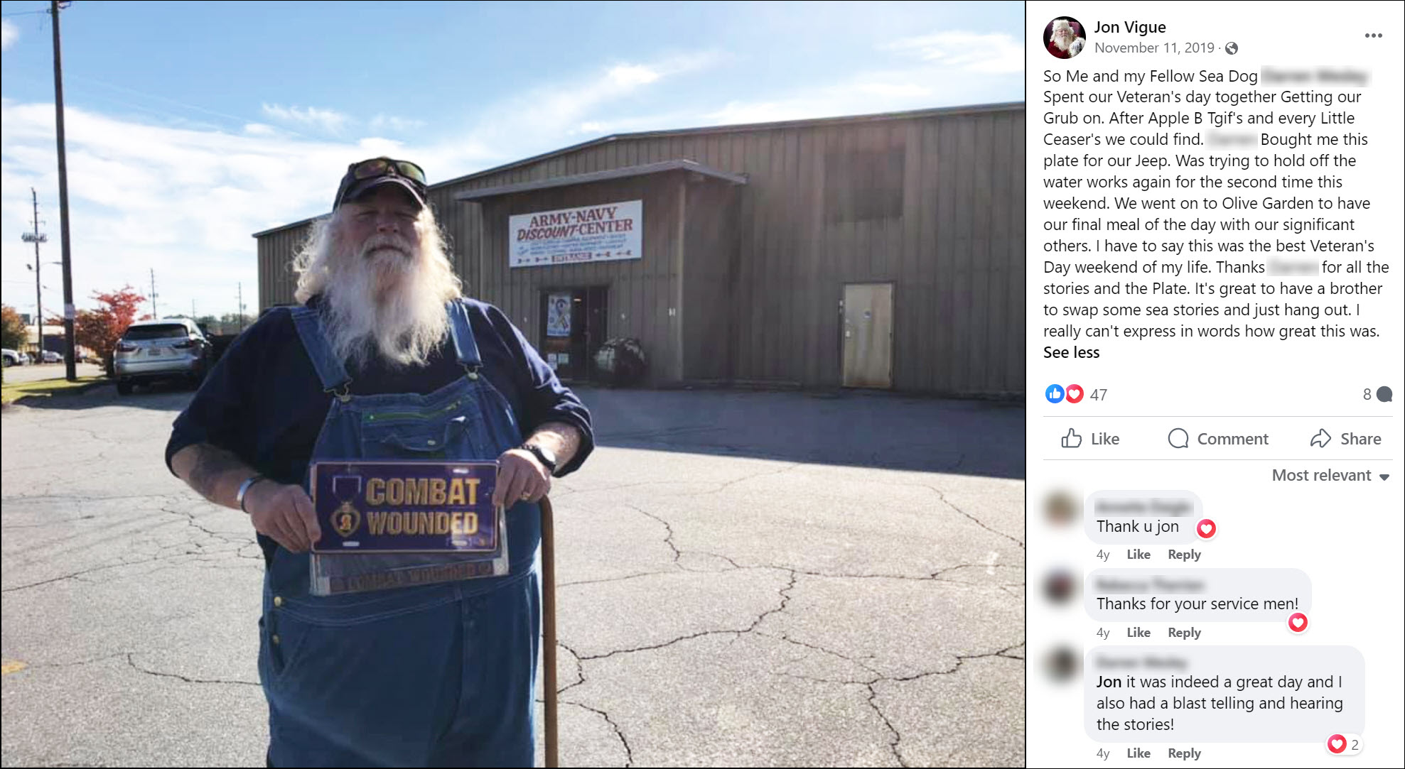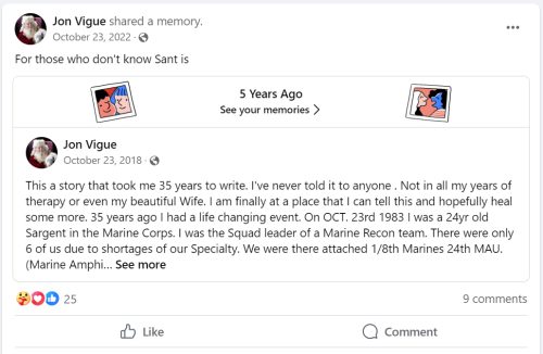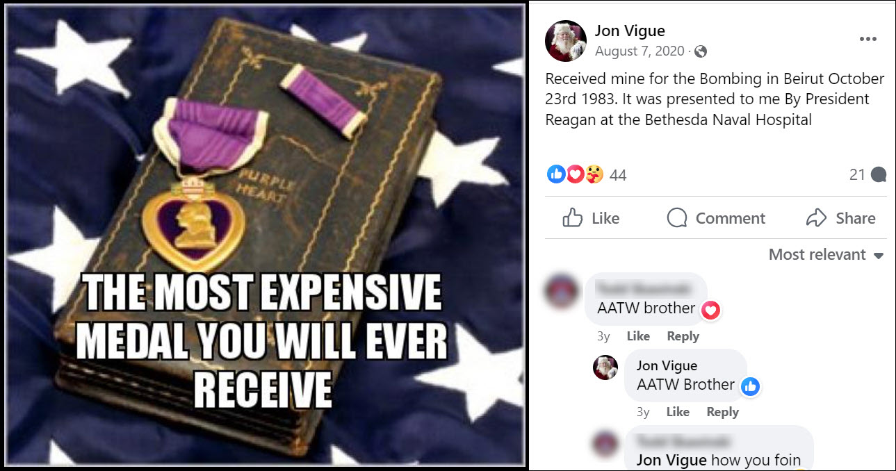 Vigue repeated this same post in 2022. Vigue claims that he was awarded the Purple Heart from President Reagan in the following Facebook post, as with the Facebook post in 2018. Then, another post on Facebook claims to be Combat Wounded, but it is unclear if this is tied to Beirut, Lebanon.