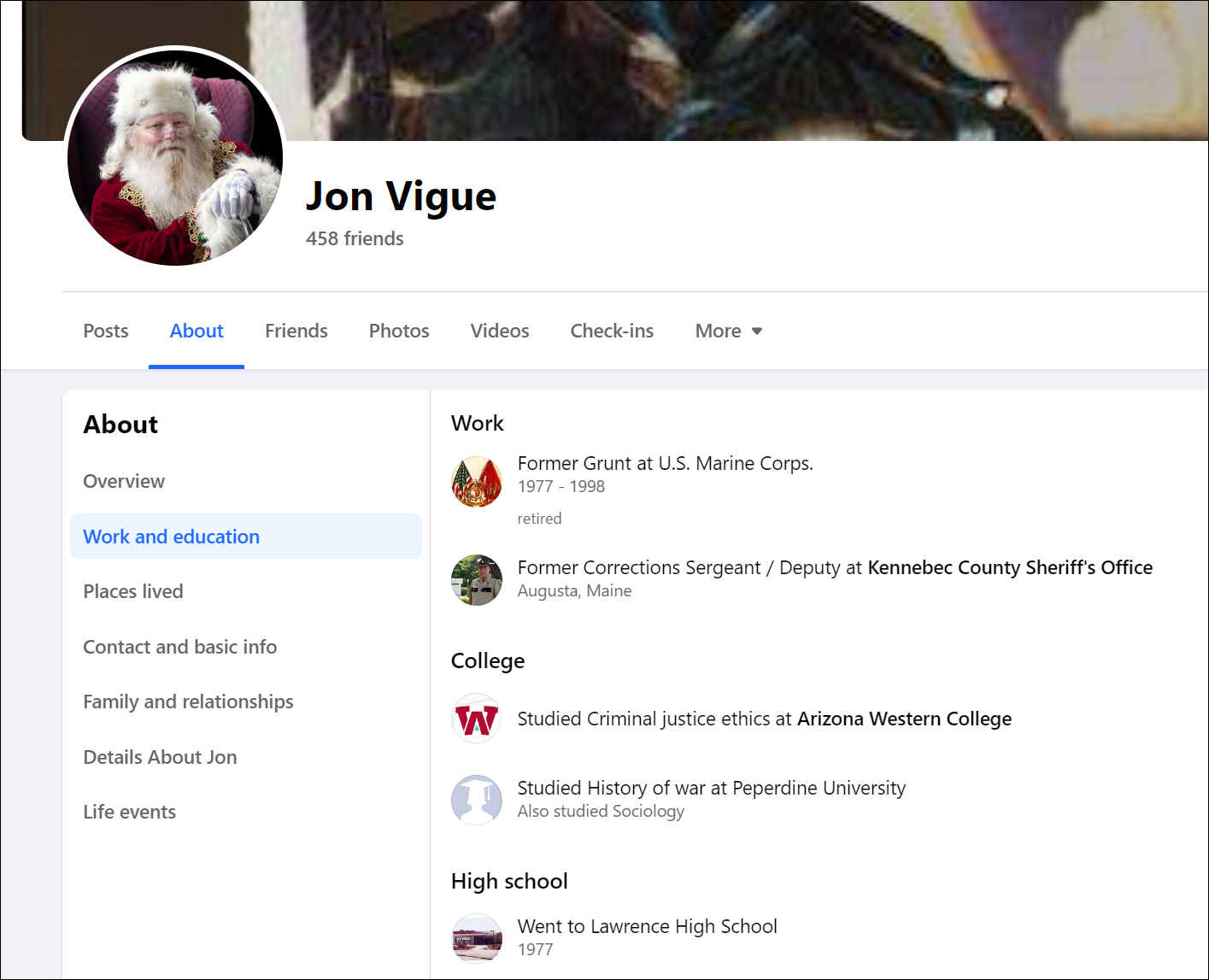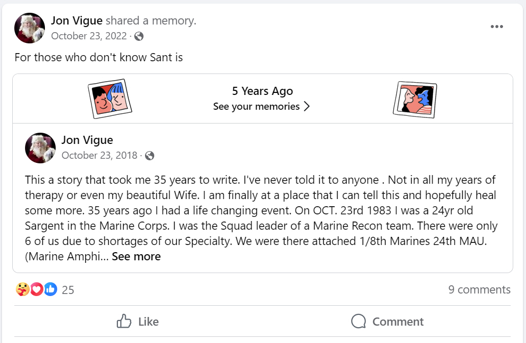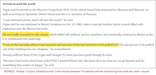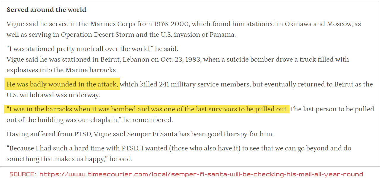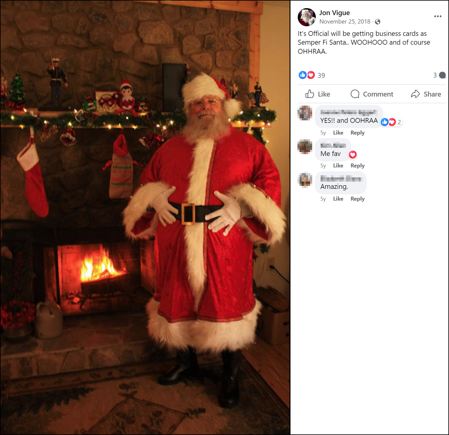 Vigue has embraced a Santa Claus image complete with the nickname “Semper Fi Santa.” Vigue has been referred to as “Gunny” but this could be just a nickname vs. any claim of rank. In this post, he also posted the logo of the Beirut Veterans of American (BVA) which is an organization in support of those that served in Beirut, Lebanon. I am a Lifetime Member of the BVA… I do not know any Vigue.