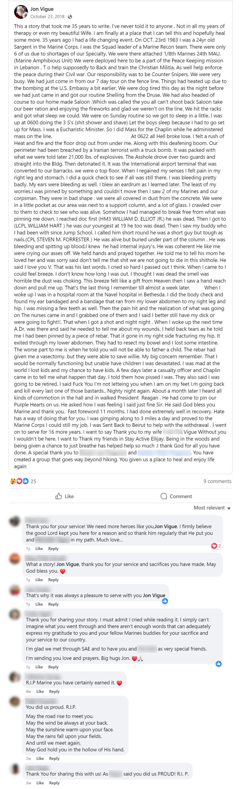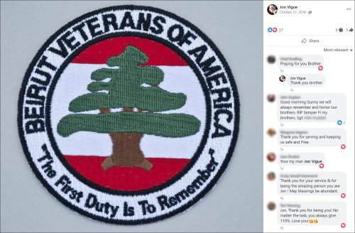 COMBAT WOUNDED In a Facebook post in 2018, Vigue claims he was in the Marine Barracks building in Beirut in 1983 when it exploded, and he was wounded quite severely.