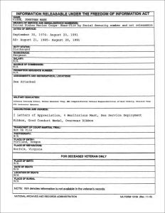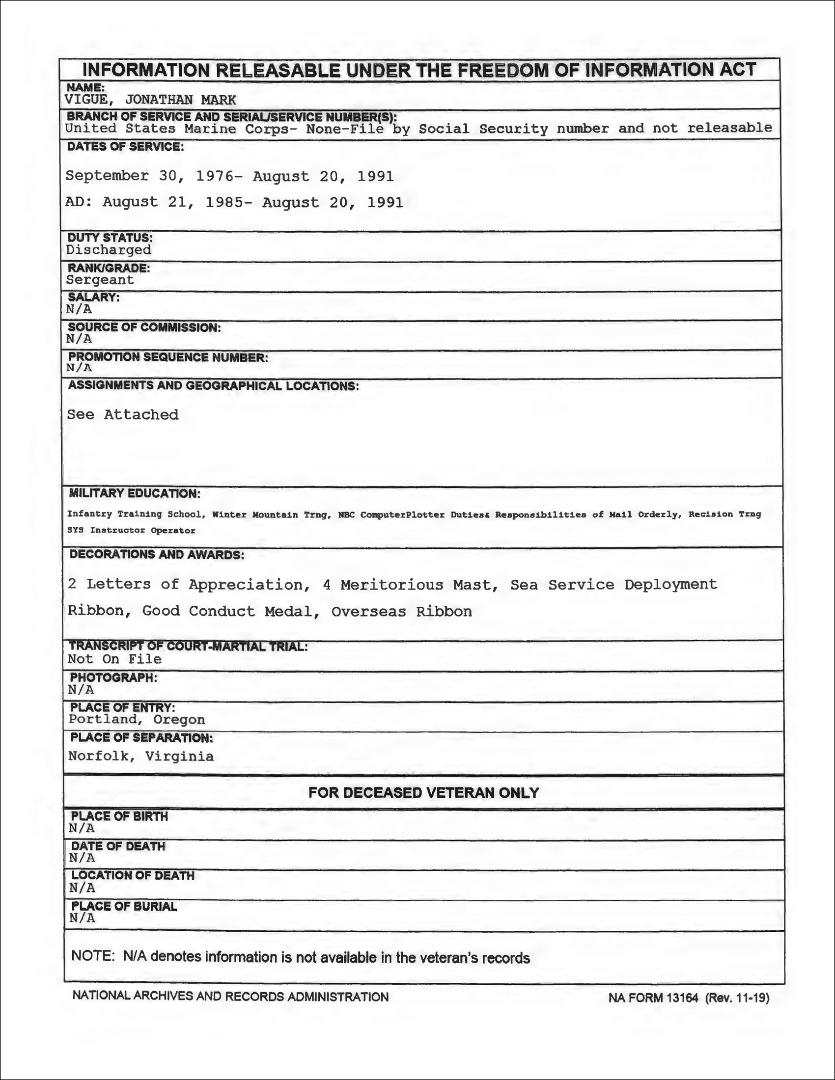 Jonathan Vigue’s military records were ordered through a Freedom of Information Act (FOIA) request. We filed with the National Personnel Records Center (NPRC).