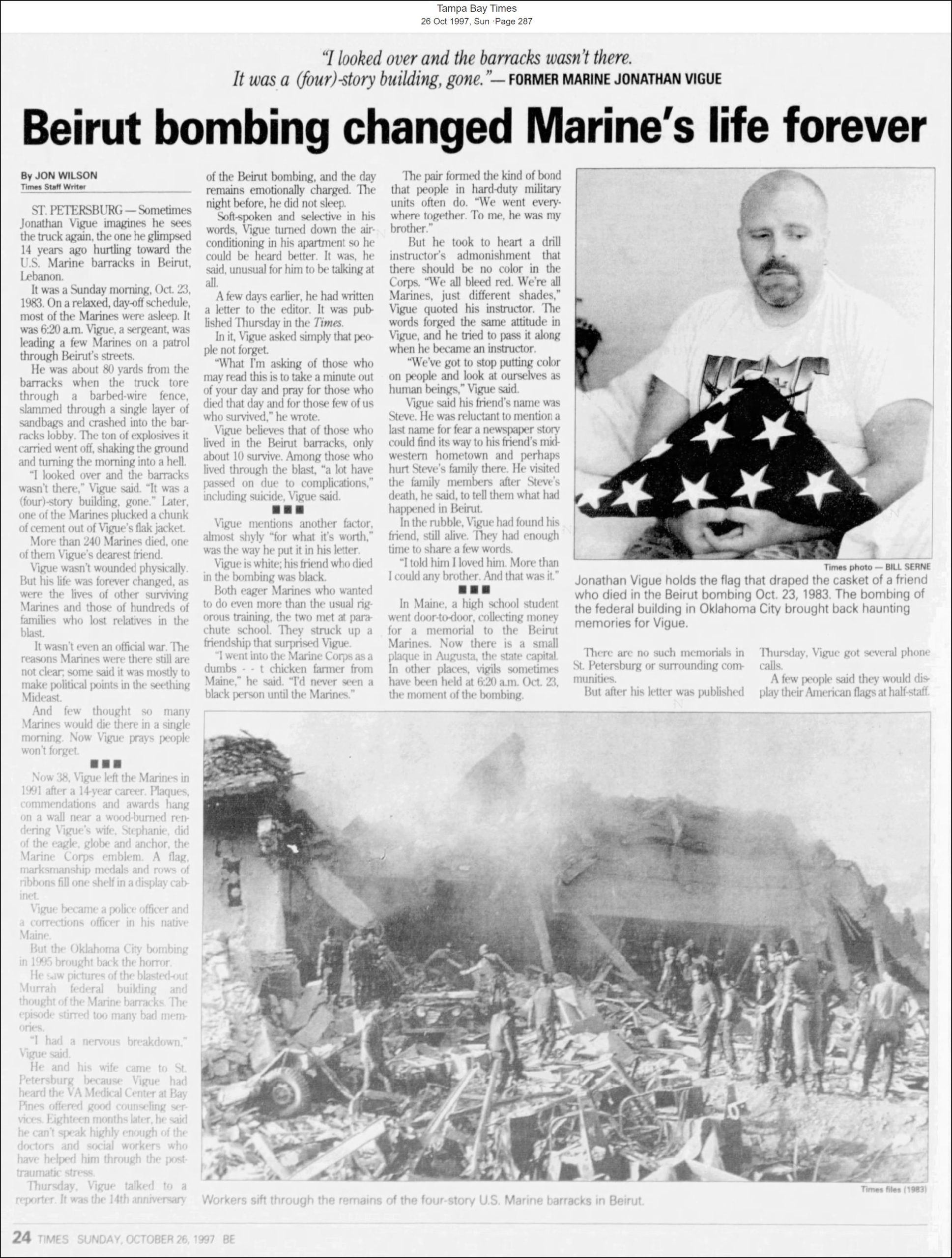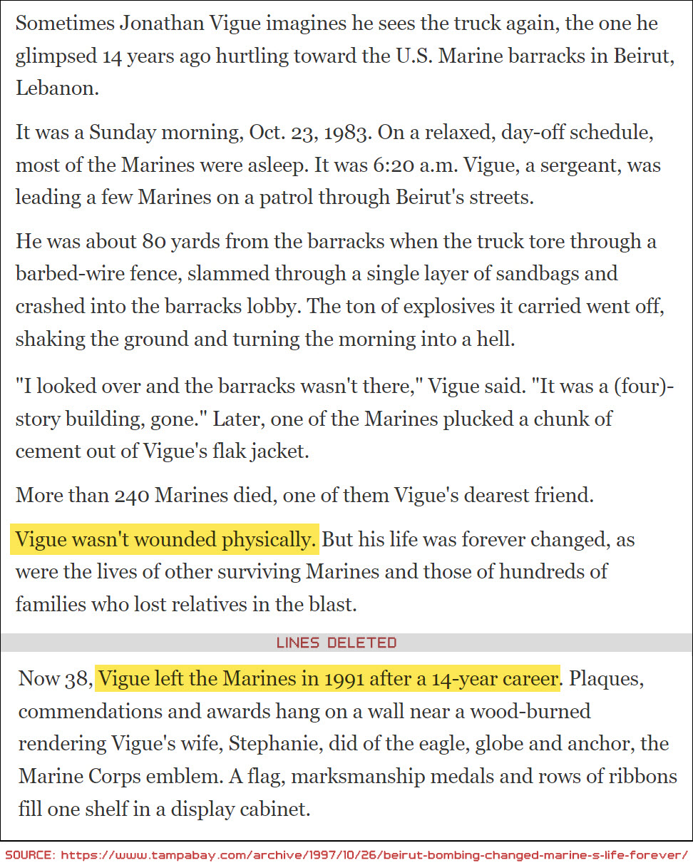 It also claimed in the article that he was not wounded. It claims he was in Beirut at the time of the Marine Barracks Bombing in 1983. In this more recent article, it is claimed that Vigue was in the Marine Barracks building when it was hit. I was there until the very last Marine left to head home… I do not know Vigue.