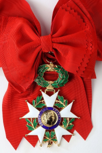 For his World War II service, Clostermann earned more than two dozen citations in orders. This is represented as 27 award devices on his Croix de Guerre (1939-1945 version). Seventeen of those were at the army level as represented by bronze palms (though I count 27 in the above picture). Other pictures of his awards show at least one gold gilt palm, a World War II only award for a mention in dispatches at the Free French Forces level. Depending on the level at which one was cited, these are analagous to an American Silver Star or Bronze Star Medal w/ “V”.
