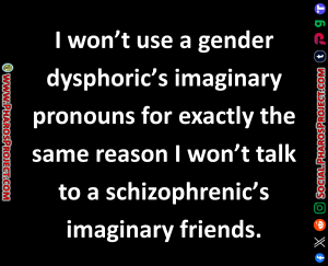 The most pronoun happy people usually come from the younger generations, mostly Gen Z and some younger Millennials; people who have been catered to for their entire lives while often living in a fantasy world where online gaming, social media influencers, and overall lack of personal interactions has warped them into believing they can be anything they want to be. While I don’t agree with the transgenda, I will at least try to attempt to use gender-neutral language and give as much respect as I get. But when you add more genders than man and woman (even if “trans” has to be inserted before it), I refuse to use your custom “Bronie/Zhear” nonsense.