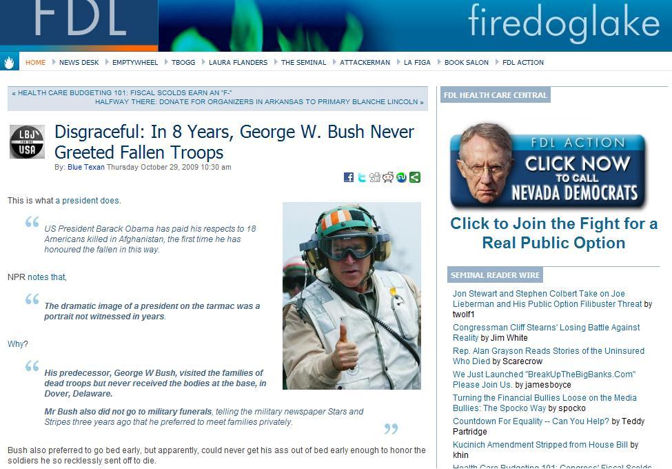 The mantra that Bush never did it can’t be verified, because Bush went to Bethesda and WRAMC all the time without anyone knowing about it. He didn’t announce it and didn’t take the press corps with him when he did go.