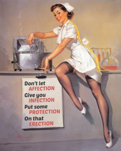 Us Old Geezers remember when nurses wore a nice uniform…with stockings and garters. That was well before some SoB invented “scrubs”. I think he was the same SoB that invented panty hose. We also remember the “Training films” that emphasized the importance of “No glove…No Love”.