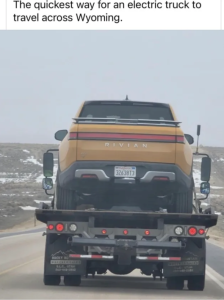 Not sure I understand the thing with a Rivian on the back of flatbed for delivery. There are lots of charging stations on I-80 not just Tesla Superchargers. That particular Rivian is a Quad Motor so it gets about 330 miles to a charge, so yes it would have to stop on its way from Salt Lake City to Cheyenne, but it could do it in less than 30 minutes and be at 80%, so still faster than an old slow flatbed!