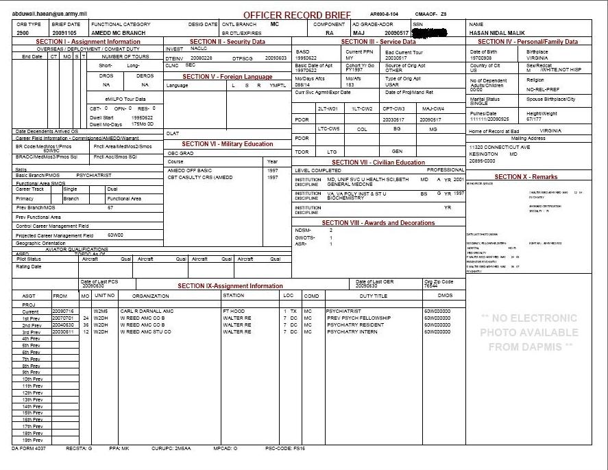 I just caught this site and his ORB via Blackfive. Their post brings up some interesting questions as to gaps in his timeline. I find it very interesting that he chose to list no religious preference. Seems way off base for anyone who is devout.