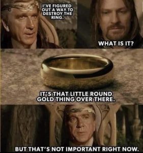 *snickers* You knew he’d do it! “The One Ring to rule them all…” ‘sides that, we needed an example of “attack with a blunt object.” 😉