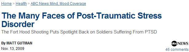 The article is typical of ABC’s increasingly sloppy reporting. It’s supposed to be about suicides, but doesn’t provide any cause and effect relationships between PTSD and suicides. Then they segue into how PTSD may or may not have affected Hasan. Of course we know now that he’s never actually deployed any where so it must be the Pre-PTSD angle they are going for.