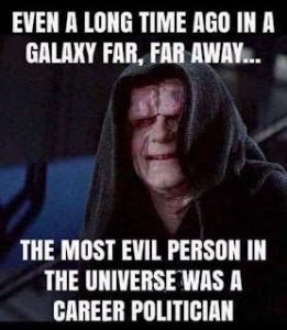The true villain, Palpatine, is a career politician who–with the aid of others–maneuvered his way to turn the Republic into an Empire led solely by him. Our current (p)Resident-in-Chief is a career politician who spent years maneuvering his way into our highest office, supported by his fellow Dems and turncoat Reps. I’m not calling FJB a Palpatine-like character; it seems that the Clintons and Obamas are more likely to be pulling strings that most of us can’t see.