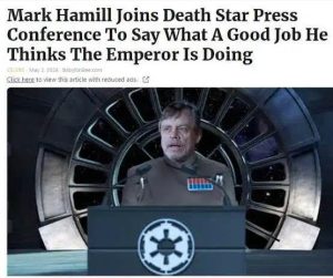 Lots of Star Wars memes for some odd reason… It’s almost like a B-List (at best) actor who is known primarily for playing an iconic hero in the series became a real-life villain. I’ll play film school student and theorize as to why Hamill’s pro-FJB antics are so disturbingly amusing.