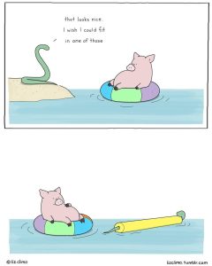 The cartoon at the top of WOT reminded me of a news report of some time ago. Some officials of the PR of MA decided to make an island in the Quabbin Reservoir a protected habitat for timber rattlesnakes. I’m lead to believe none of the officials had ever seen a timber rattler; if they had, they’d have known those things can and do swim.