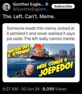 Posted in Guest Post Humor SchadenfreudeBoomer’s Sundayby AW1Ed•July 7, 2024July 6, 2024•9 Drinking from a firehose with the flood of memes. Thanks, Usual Suspects! AW1Ed More by AW1Ed