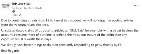 We will no longer post our articles from the site to Facebook. They continue to threaten to shut down our account with petty and ridiculous claims of us violating their TOS.