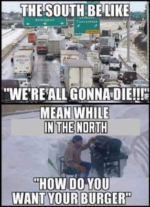Bring that trophy wife down heah and I’ll gift her with a nice cast iron skillet soes she can practice her frying techniques. And iffen you don’t want to stay, GTFO of them ‘burbs, ’cause it’s coming shore as the Good Lord turned that boollitt at the last minute.