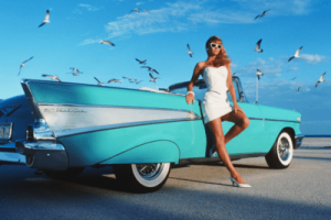I think the 57 Belair was a little higher on the rear fins. Could be a 56. My Friend Elliot’s sister graduated H.S. in 1957 and her parents bought her a 57 Belair which was the same color in the above pic. We washed it all the time and listened to Alan Freed on the car radio.