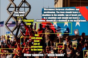 These are just samples, of which there are many. Photos from another rally had an audience member with his head upside down, a woman with her hands blending into her face, a guy with an unusually long neck, people looking like they’re sharing the same seats, and other hilarious AI “glitches.”
