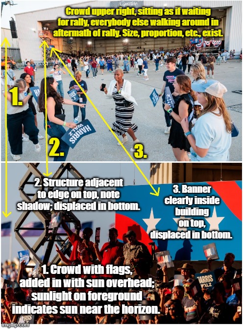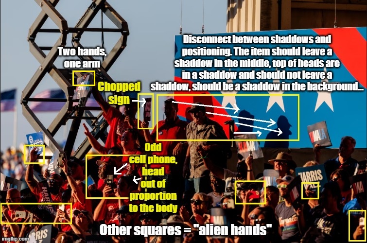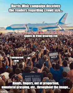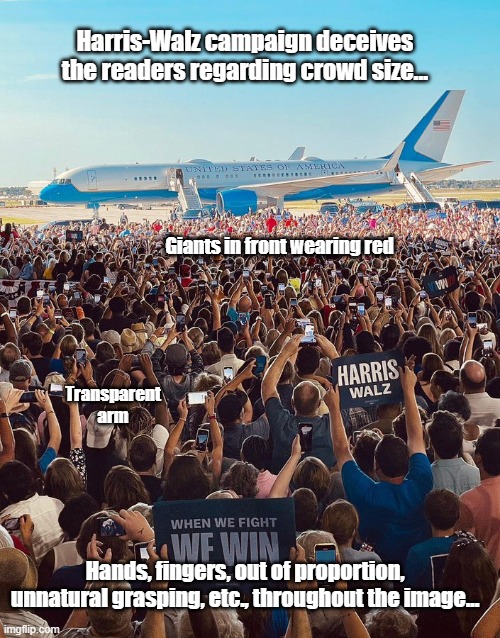 Again, I expanded the video, just as I expanded other images of the so called “large” Harris rallies. I’ve utilized AI to generate a lot of images, including what I’ve used in my posts, as well as memes that I wanted to make from scratch. I’m seeing the same things in your link and in other images from Harris that I’m seeing in these images that I have AI generate.