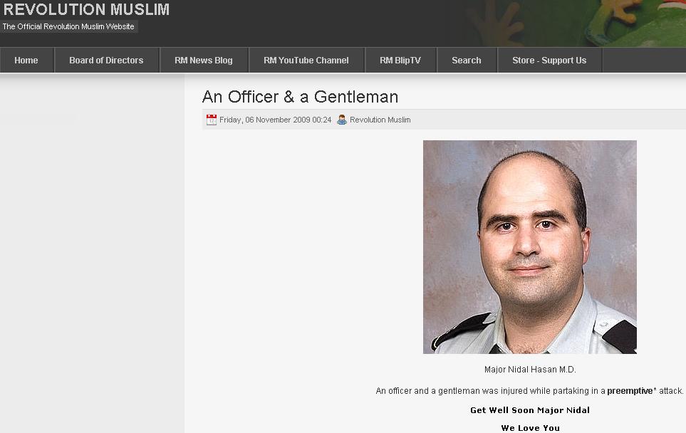 Ya know, that’s all well and good, but how about pulling aside the radical clerics operating across the world and urging them to repent, too. How about a little preventive maintenance on Islam. Another good place to start is with those Revolution Muslims – they’re the guys who called Hasan an “officer and a gentleman” for murdering 13 (14) people.