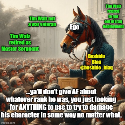 We came, we served, we conquered, and no one gives a rat’s ass about what we once did or were besides ourselves and our true comrades (many of whom are regulars here). Walz is waltzing around playing Big Daddy CSM when he was, at most, the background fiddler in the world’s loneliest Bluegrass band.