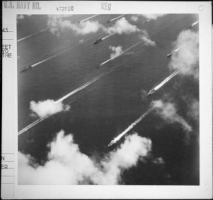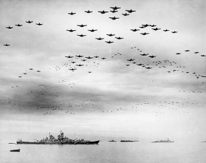 A full ten battleships (eight American and two British) were present. This included USS West Virginia (BB-48), which had been sunk in the Japanese Attack on Pearl Harbor, was refloated, repaired, and saw action at Leyte, Iwo Jima, and Okinawa. Among the other ships were six light or escort aircraft carriers, five heavy cruisers, 10 light cruisers, 51 destroyers, 11 destroyer escorts, three frigates, 18 minelayers and minesweepers, and 12 submarines. More than 300 ships in total!