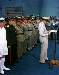 One of the American representatives at the ceremony was Fleet Admiral Bull Halsey also wanted to contribute some deep symbology to the Japanese. In July 1853, 92 years before, an American fleet of warships led by Commodore Matthew Perry (younger brother of War of 1812 hero Commodore Oliver Hazard Perry) entered Tokyo Bay. The insular Japanese had steadfastly refused modernization and trade with the rest of the world. Perry’s fleet was sent as a show of force, which led to Japanese acquiescence to American demands for a trade treaty.