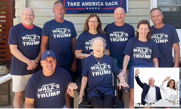 Eight members of Walz’s family posed for a photo wearing ‘Nebraska Walz’s for Trump’ shirts while standing in front of a ‘Trump 2024 — Take America Back’ flag.