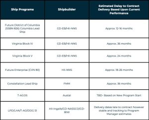 EVERY program is behind. Not just the (snerk, snicker) Littoral Combat Ships…every damn one. Best of the lot is that last one…and that comment box in English instead of bureaucratese says “They ‘re late but we already figured they would be.” Unlike the aircraft carriers getting refueled at five years a whack – they are just late.