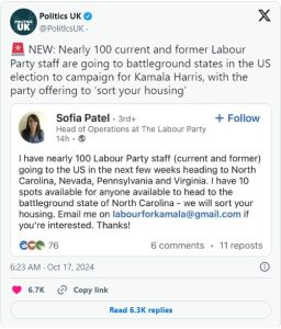 In the last two months, the Washington Post and Politico, among others, have run a series of features about British advisors from Labour Together rescuing the distressed political damsel that is the Harris/Walz campaign. Politico casts McSweeney as the “election mastermind” who first helped Keir Starmer defeat leftist Jeremy Corbyn to become the head of Labour, all the way to Starmer’s “landslide” win over Conservatives to become Prime Minister this past July, implying that McSweeney and his team can perform a similar miracle for Harris.