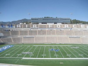 The upper bleachers of Falcon Stadium are colored so that the words “Air Force” can be read when the stadium is empty. But this week, Army (or its fans, no one really knows) found its way into the empty arena and painted it to read “Chair Force” for passersby.
