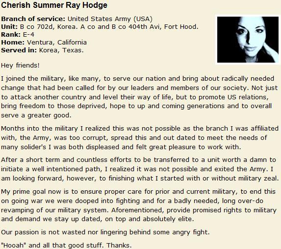 Of course, both of them have never been to Iraq or Afghanistan, that’s a membership requirement now, apparently. So they’re not speaking of the war, although they’d like to think they are. Here’s Cherish Blah Blah Blah’s profile from IVAW;