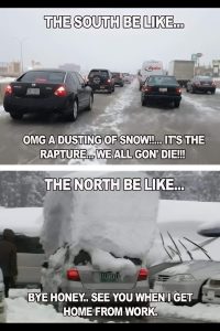 Speaking of Southerners and snow. When I was stationed at George AFB, CA, in the High Desert, they literally shut the base down because there was a dusting of snow.