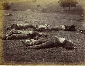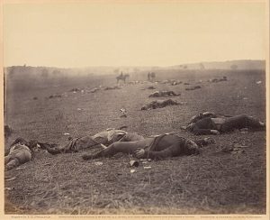 This week’s piece will be a little different from the usual fare. The above photo is something you’ve surely seen before. It’s called “A Harvest of Death” and is one of the most famous Civil War photos. It was taken by Timothy O’Sullivan, an Irish immigrant. He claimed to have at one point early in the Civil War been commissioned a second lieutenant in the Union Army, but that may have been an embellishment. He was, at the time of this photo’s taking, working under Alexander Gardner, who was the principal photographer for Union General McClellan and his Army of the Potomac.