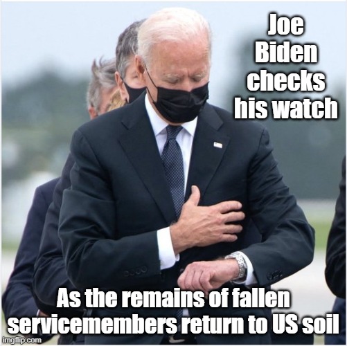There was some consolation in the outrage over the photo of Biden checking his watch, but that wasn’t the biggest or only outrage of the day. Think of this in the full context. Sitting and waiting for over 3 hours while dealing with unimaginable pain and grief, after a guaranteed sleepless night, after traveling across the country mere hours since receiving notification their loved one wasn’t coming home … And then being condescended to by Jill that she deigned to bestow the blessing of her presence; that her doddering, senile charge’s presence was all that should matter to them, the families; after staff treated them as if they, the staff, were in charge and not Morturary Affairs as they disrespected the families and military decorum.